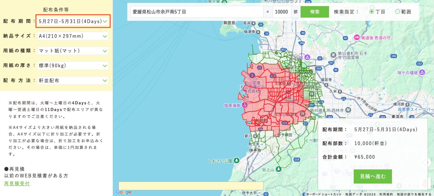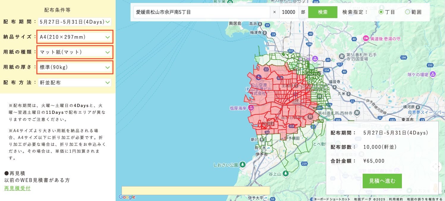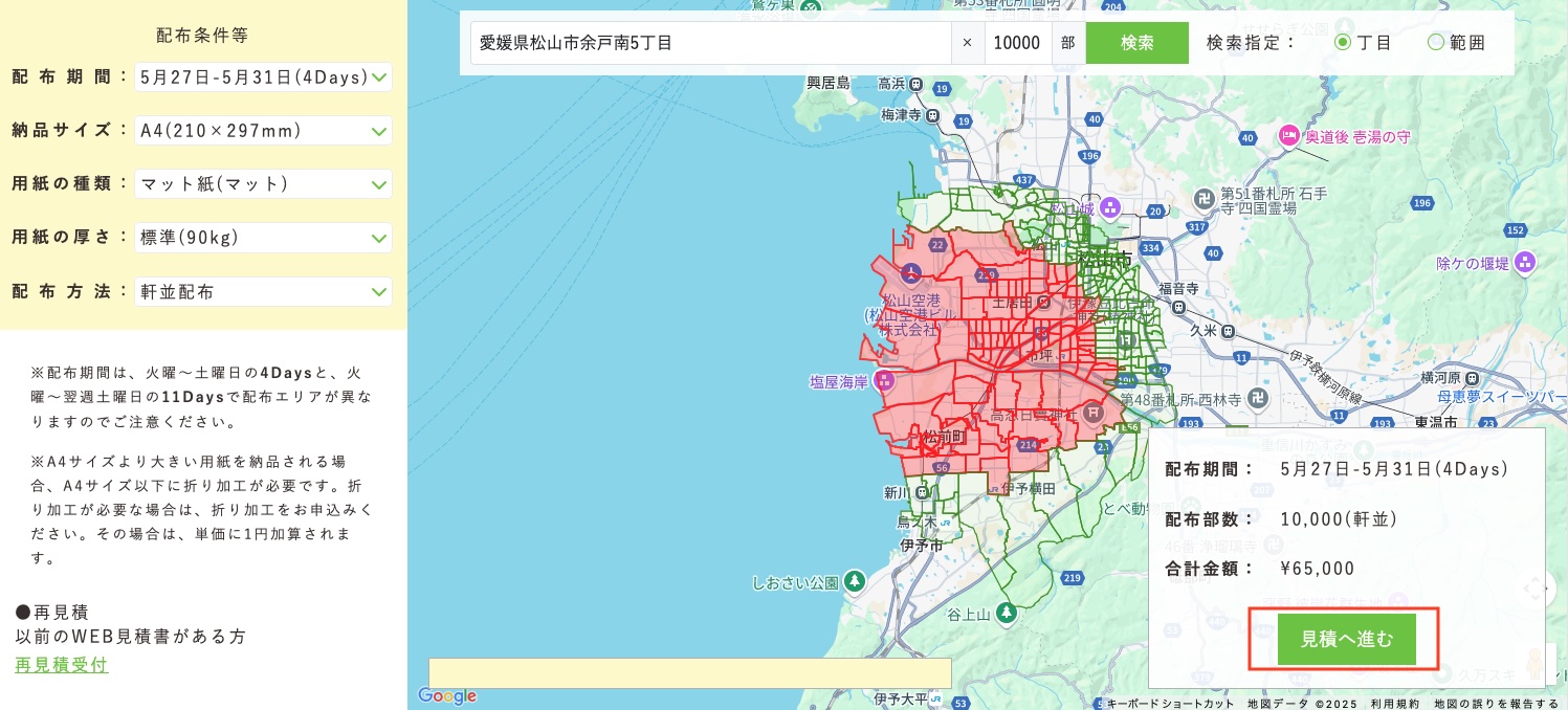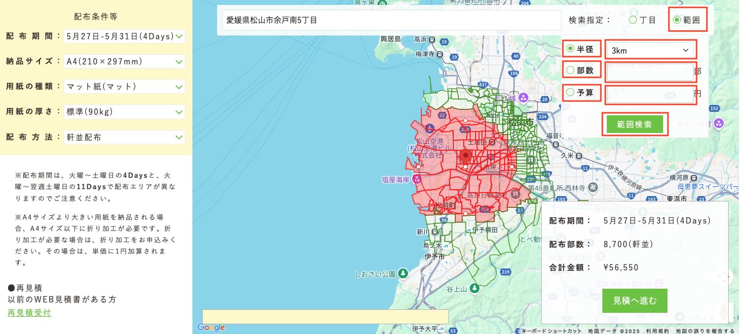 丁目住所から指定した予算金額までの配布エリアが選択されます。※.3