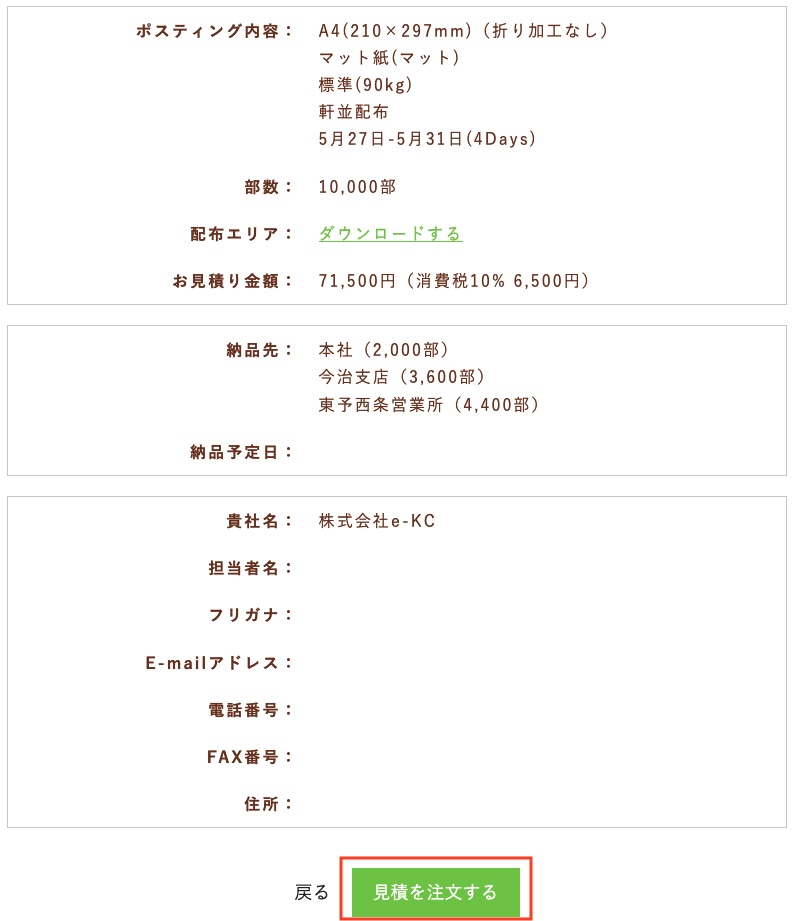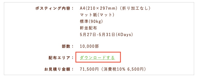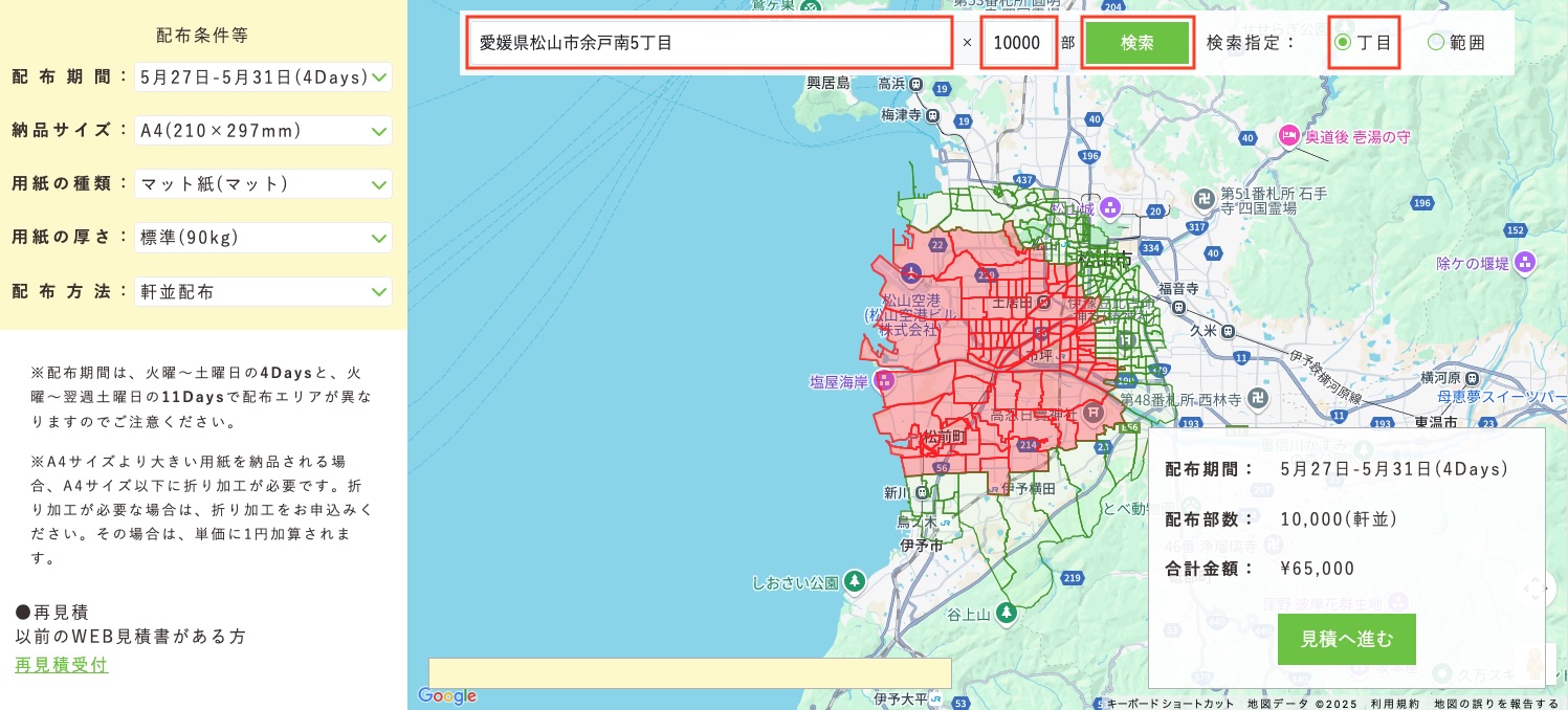 弊社の配布区域対象の「丁目住所」を入力し、さらに「配布部数」を入力してから、検索ボタンを押してください。